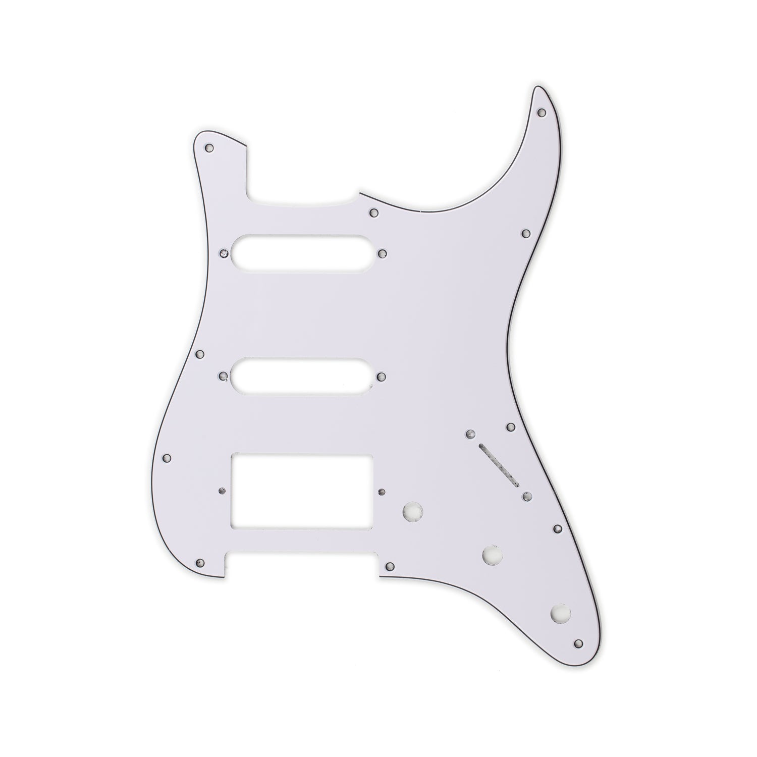 - 11 mounting-screw holes seat the pickguard firmly against the Strat top
