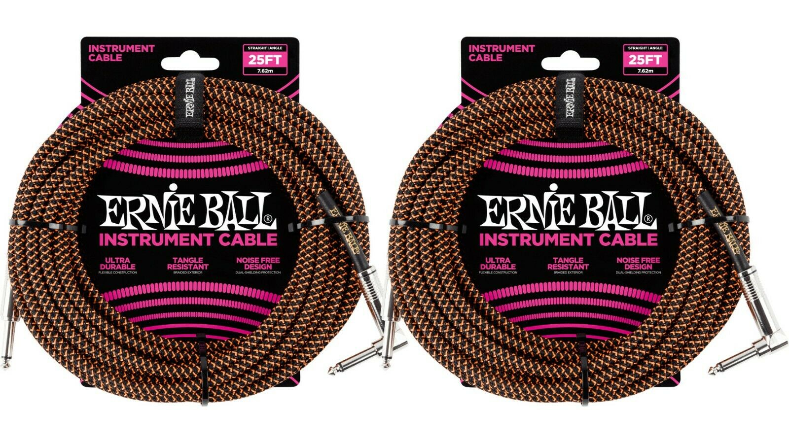 Ernie Ball 25ft Braided Straight Angle Inst Cable Black Orange 2 Pack