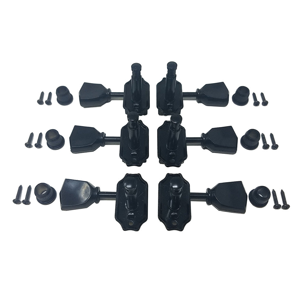 Wilkinson 3x3 Black Aged Vintage Tuners for Gibson/Epiphone Les Paul SG® WJ-44-BK are perfect for guitarists looking for a classic look. These tuners feature a naturally-distressed aged patina over machine heads and a black finish with black keystone button. Each tuner back is stamped for authenticity.